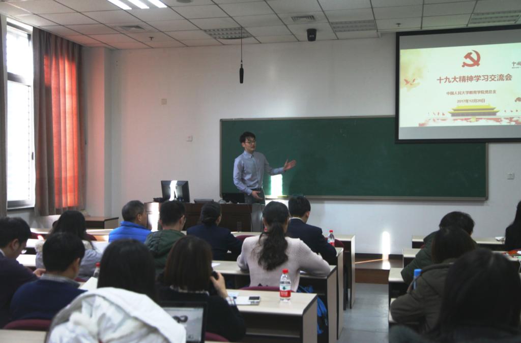 各支部学习成果交流展示由博士生党支部开始。2017级博士生刘军伟介绍了博士生党支部党团联动、线上互动,全员深入学习十九大精神,随时随地跟进十九大动态的情况。特别介绍了博士生党支部结合十九大报告讨论高等教育的发展内涵,分享了关于“人才培养”、“科学研究”和“服务社会”等内容的讨论结果。