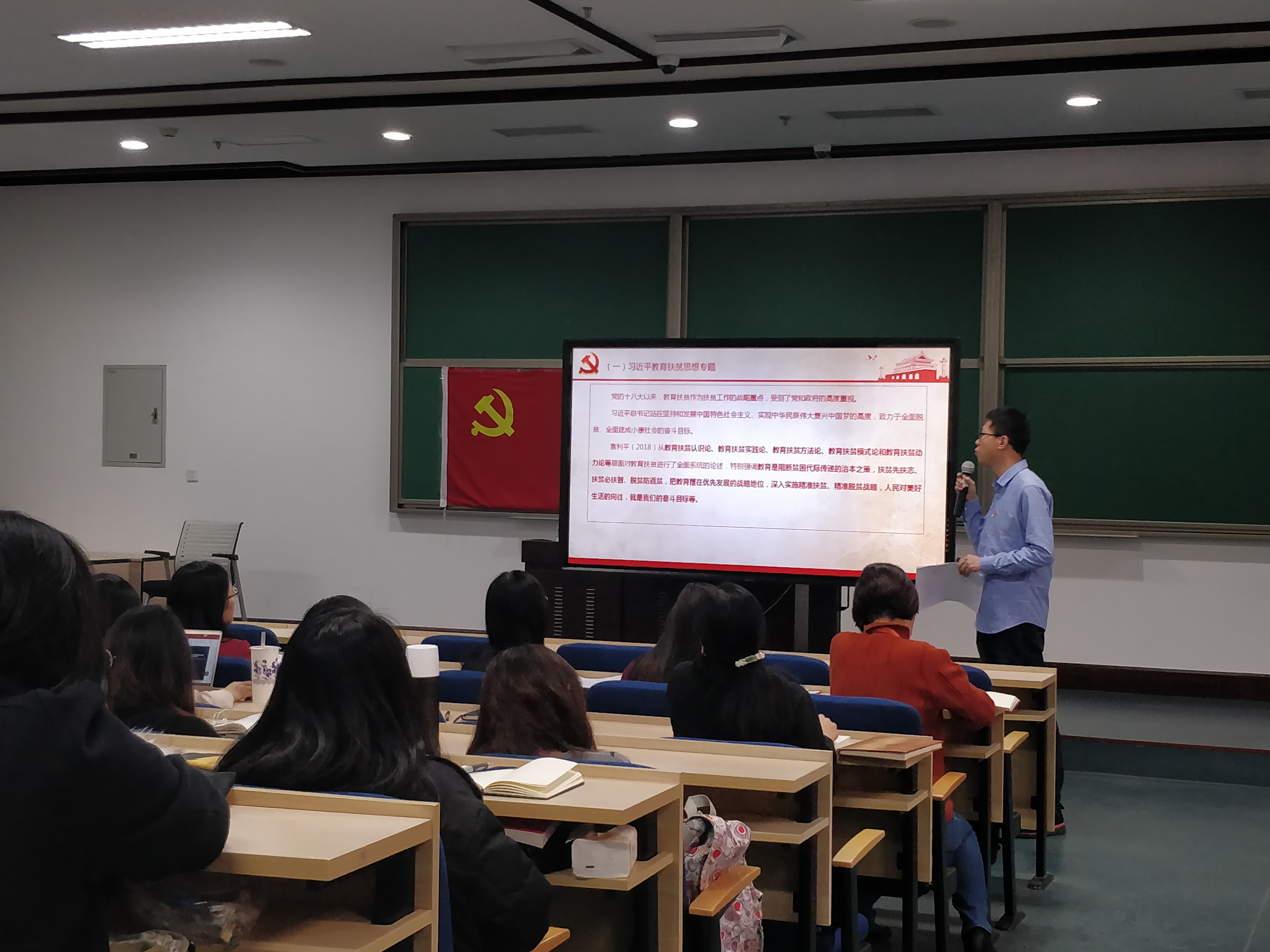 2018年12月19日,为深入学习贯彻习近平新时代中国特色社会主义思想,落实党的十九大精神和全国教育大会精神,坚持立德树人根本任务,加强基层党组织建设,我院党总支在国学馆114教室举行学习“习近平总书记关于教育的重要论述”交流述评会。教职工第一党支部、教职工第二党支部、博士生党支部、2017级硕士生党支部和2018级硕士生党支部的全体党员参加此次活动。党总支书记兼副经理张晓京及部分教师代表出席活动。党务秘书王鸿飞主持本次活动。