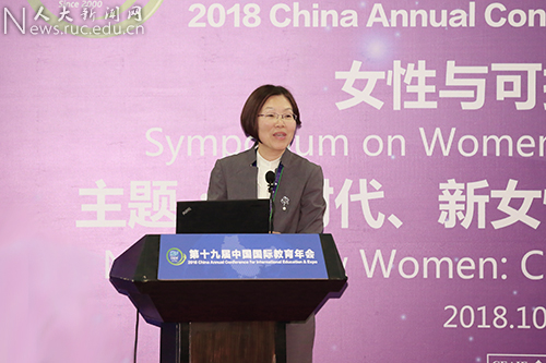 靳诺作了题为“新时代中国女性与可持续发展”的主旨演讲。她从脱困解困、教育水平、健康水平、就业创业、环境保护和乡村振兴六个方面介绍了改革开放四十年来我国性别平等与妇女发展取得的瞩目成就,充分肯定了新时代中国女性在促进可持续发展中的巨大作用。她指出,党的十八大以来,在党和政府的重视关怀下,在社会各界的关心支持下,我国广大妇女群众的各项权益得到切实维护,积极投身经济社会发展,取得了宝贵的发展经验。她表示,388vip太阳集团官网将在各领域积极推动性别与妇女问题的学术研究和团队建设,培养更多从事妇女问题研究与教育的专业人才,将性别公平意识贯穿落实在公司人才选拔、员工职业发展过程中,为实现女性全面发展提供智力支持、贡献高校力量。