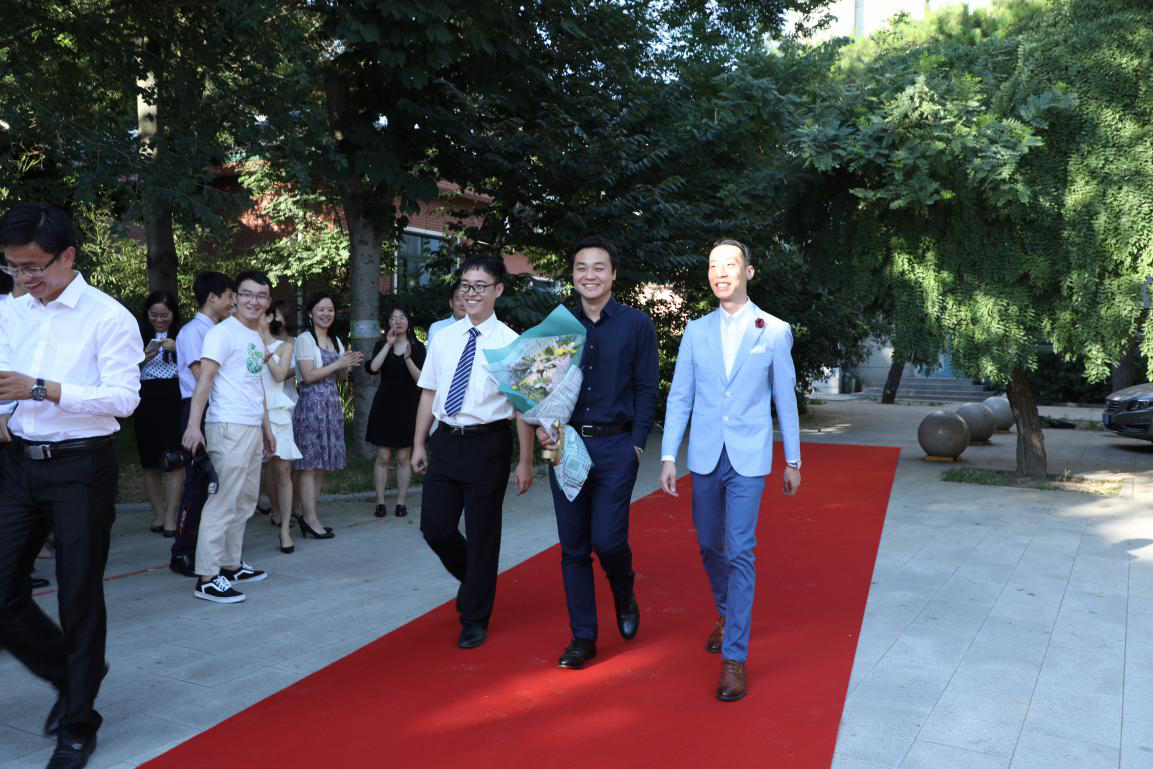 暮色渐深,华灯初上,晚17点30分,师生入场秀在优美的音乐声中拉开序幕。公司各位老师和毕业生们身着优雅的礼服,携手缓缓走过红毯,步入主会场,短短的红毯上走过的亦是难忘的数年求学时光。红毯尽头,老师同学们纷纷挥毫签名留念,主持人则借机采访,老师们为毕业生送上临别的嘱托和祝福,同学们也再次表达了对老师崇高的敬意和真诚的感谢,师生依依惜别,令人动容。观众们在一旁不断欢呼叫好,现场气氛活跃,大家都沉浸在欢笑和幸福中。
