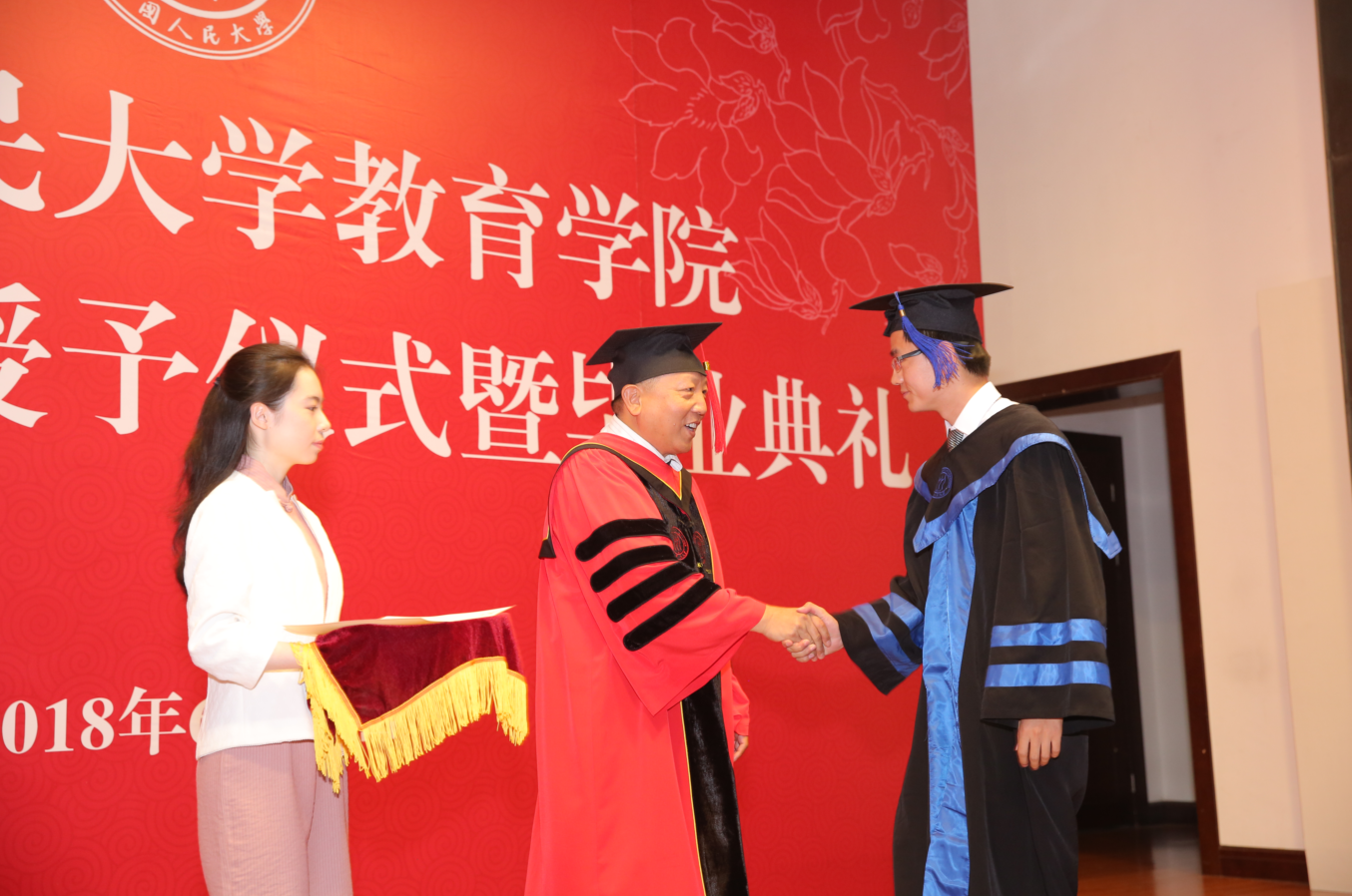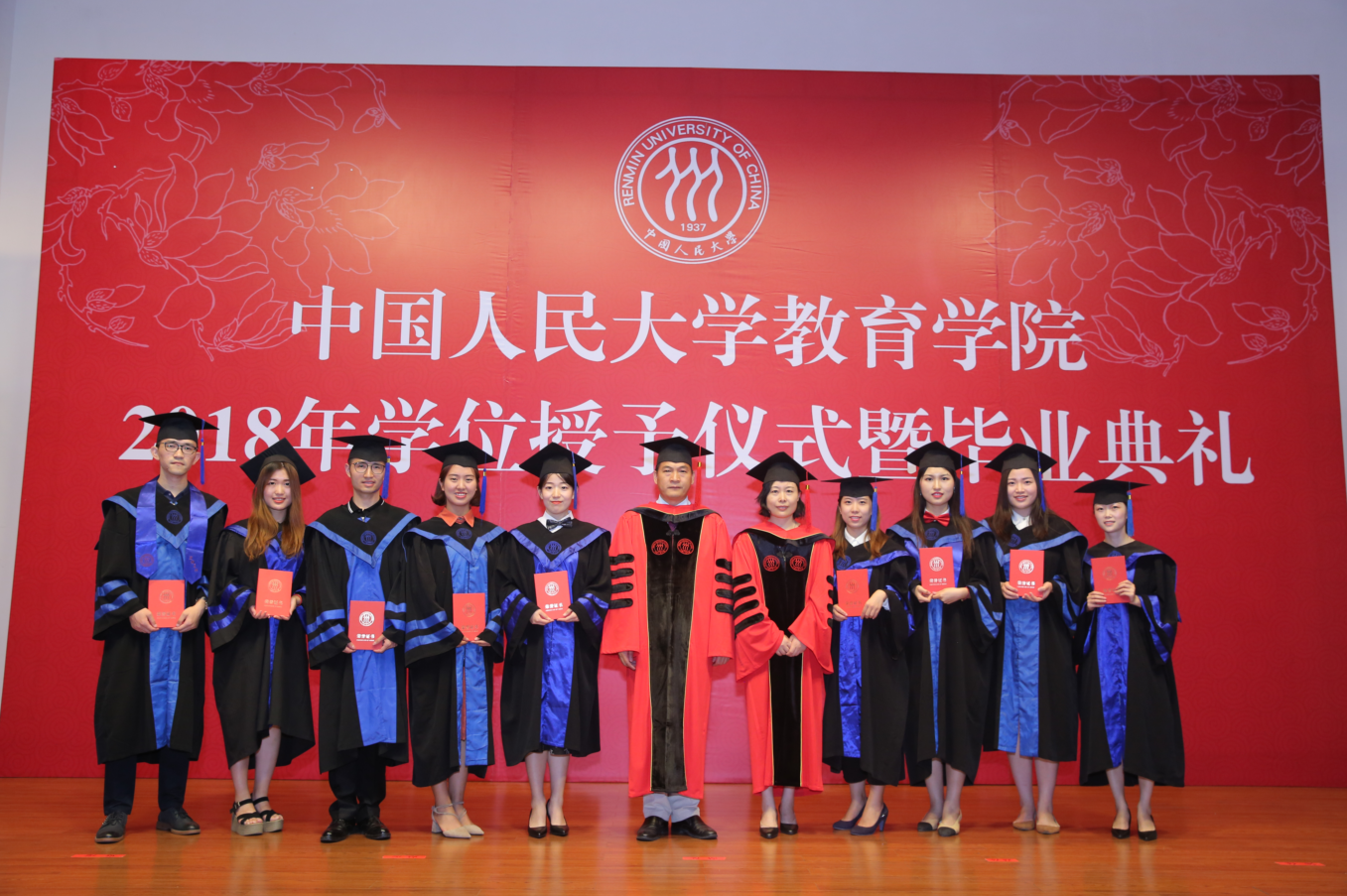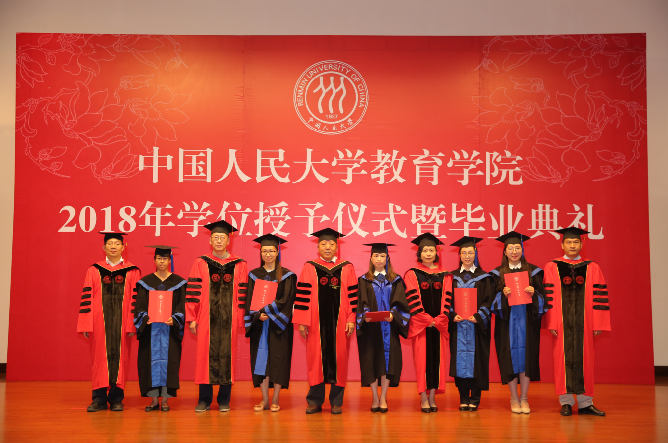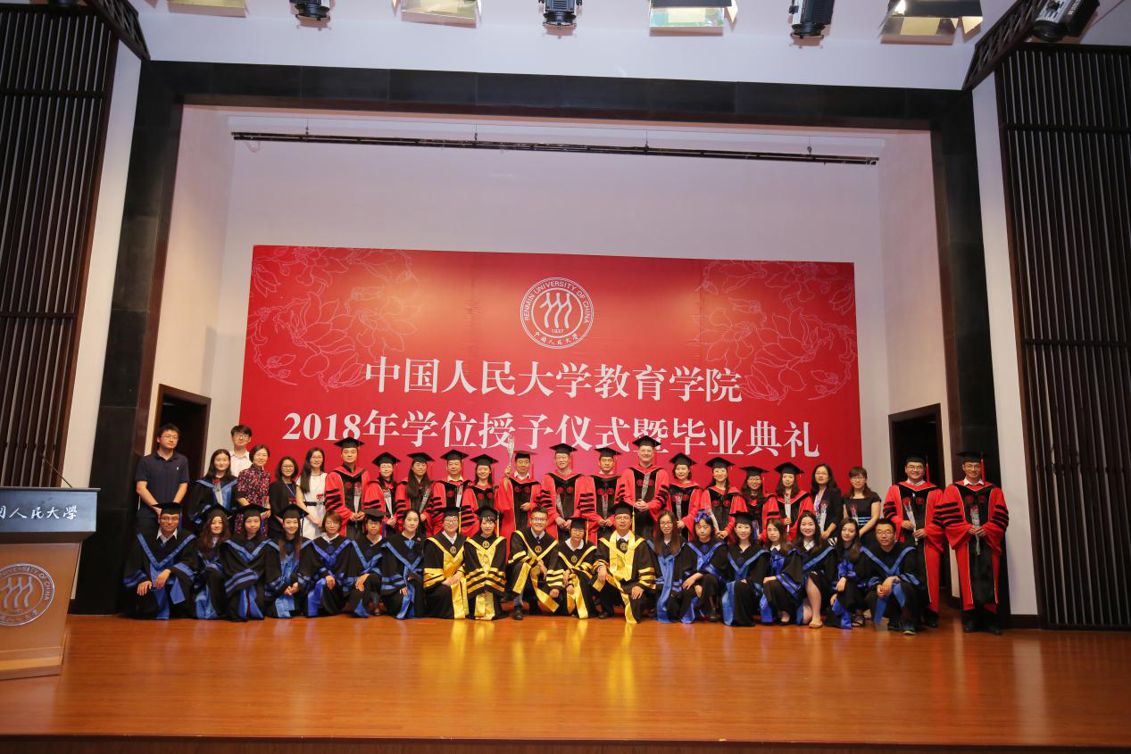决定宣读完毕,2018年硕士学位获得者在工作人员的引导下,依次有序上台,校学位委员会副主席吴晓球教授,公司学术委员会主席程方平教授,申素平教授,李立国教授,周光礼教授共同为硕士学位获得者逐一拨穗、颁授学位证书,并与其合影留念。