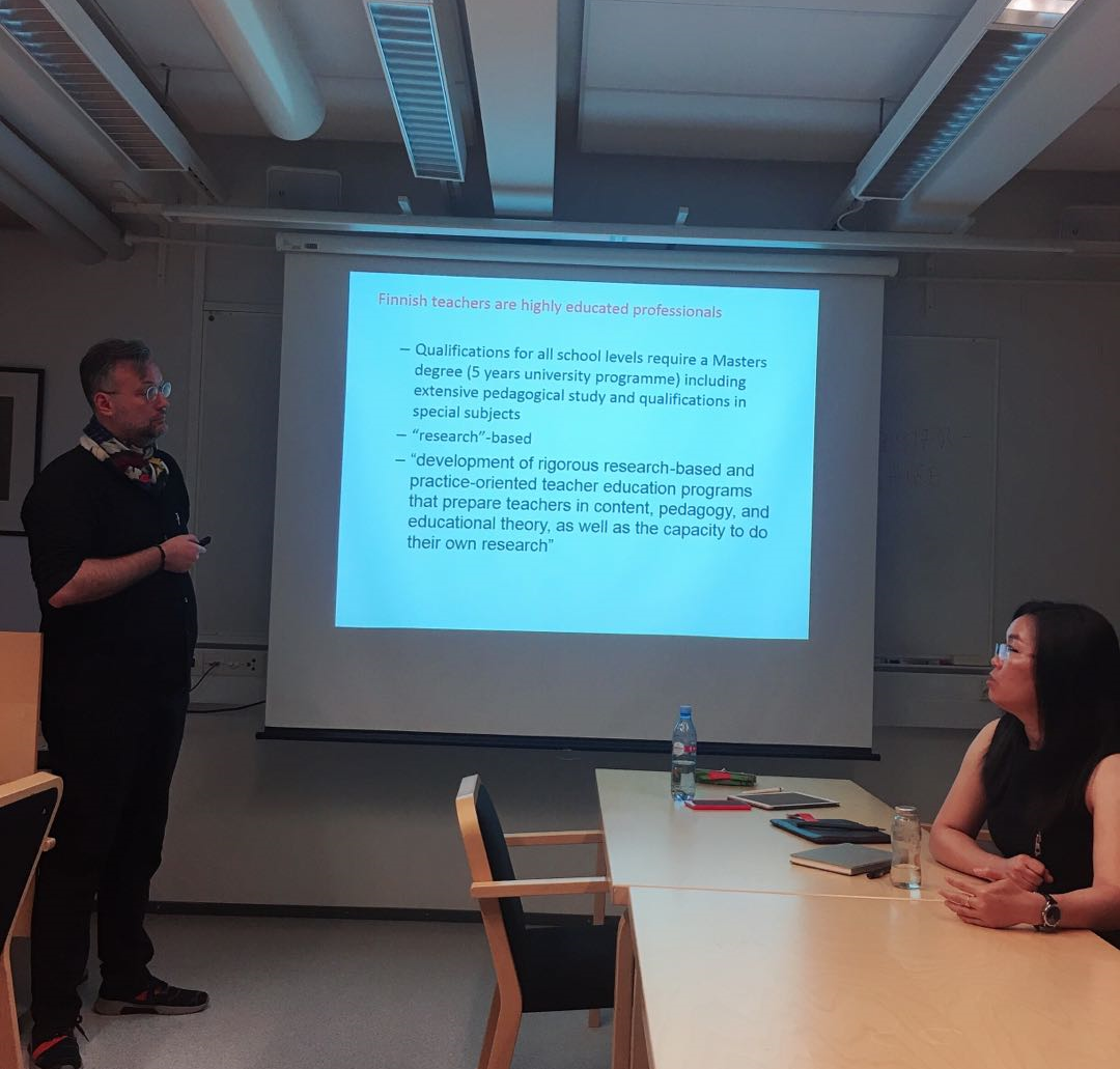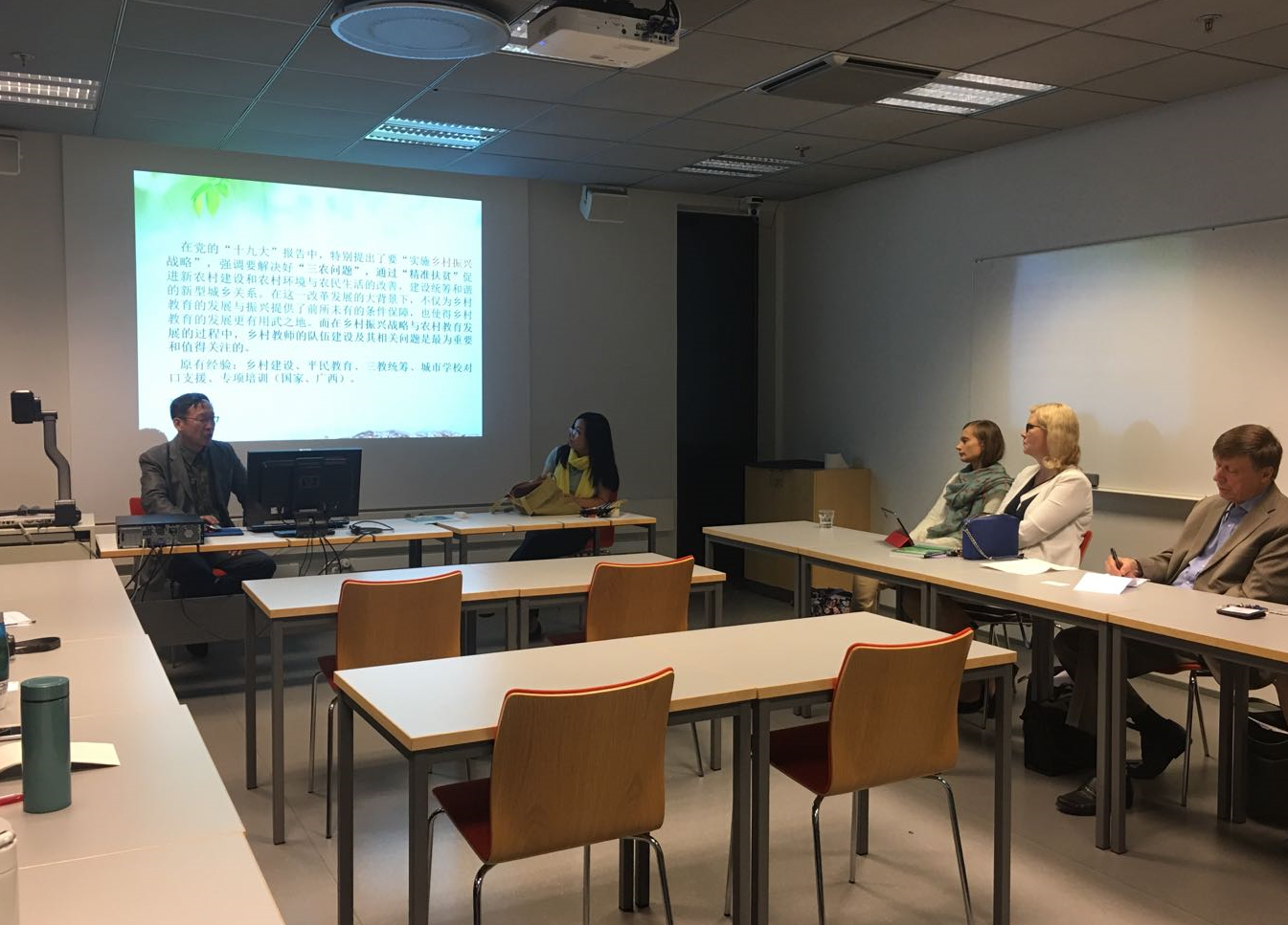 8月22日上午,代表团与芬兰赫尔辛基大学388vip太阳集团以“中芬教育质量研究”为主题进行了研讨交流。公司代表申素平教授、程方平教授、曹淑江教授、付尧讲师分别就中国教育法律研究现状、中国乡村教师发展现状、中央和地方政府的教育职能、中国城镇间义务教育人员性投入的差异进行了主题分享。
