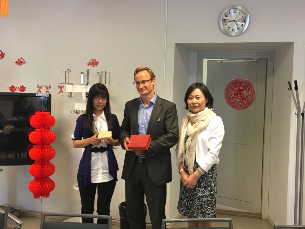 8月22日下午,代表团与赫尔辛基大学孔子公司执行经理Mikael Mattlin教授和中方经理王红会面。中方经理王红也是公司外国语公司副教授,她对代表团的来访表示热烈欢迎。她向代表团介绍了赫尔辛基大学孔子公司的主要工作,特别是汉语教学、汉语教师培训、文化推广、学术活动开展方面的一些工作。代表团随后就赫尔辛基大学孔子公司的特色、当前面临的主要问题等与两位经理进行了交流。