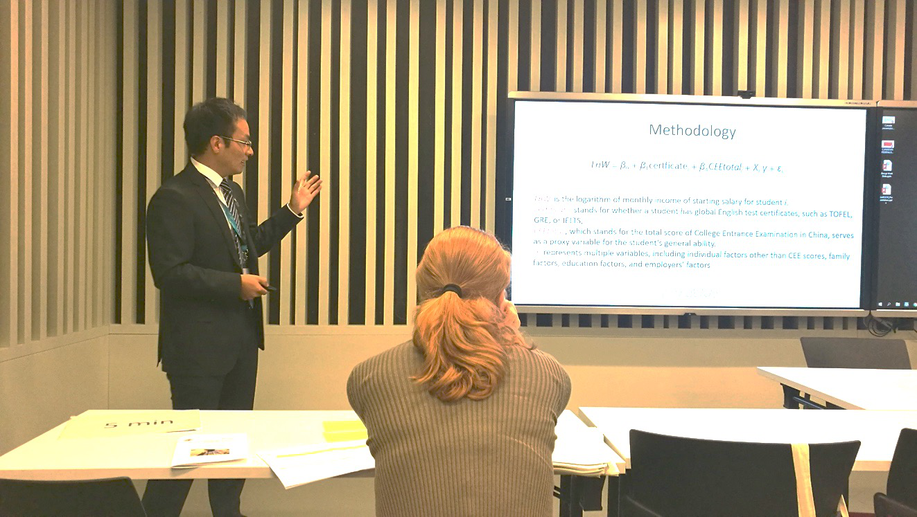 崔盛副教授和叶阳永老师的报告主要从中国老员工考取外语证书的现实问题出发,利用首都高校老员工追踪调查的数据,估算了中国大学毕业生英语能力的经济回报。 结果表明,拥有全球英语考试证书对工资溢价有额外的积极影响,而国内英语考试证书则没有。中国老员工追求国际外语证书的行为体现了员工的积极性,会在大学毕业的初次就业阶段得到相应的工资回报。研究还探讨了这一发现对中国及其他发展中国家公共政策的启示。在问答环节,与会专家对比了中国与欧洲、北美的员工就业政策,并对员工自主学习,提升专业人力资本做了深入讨论。