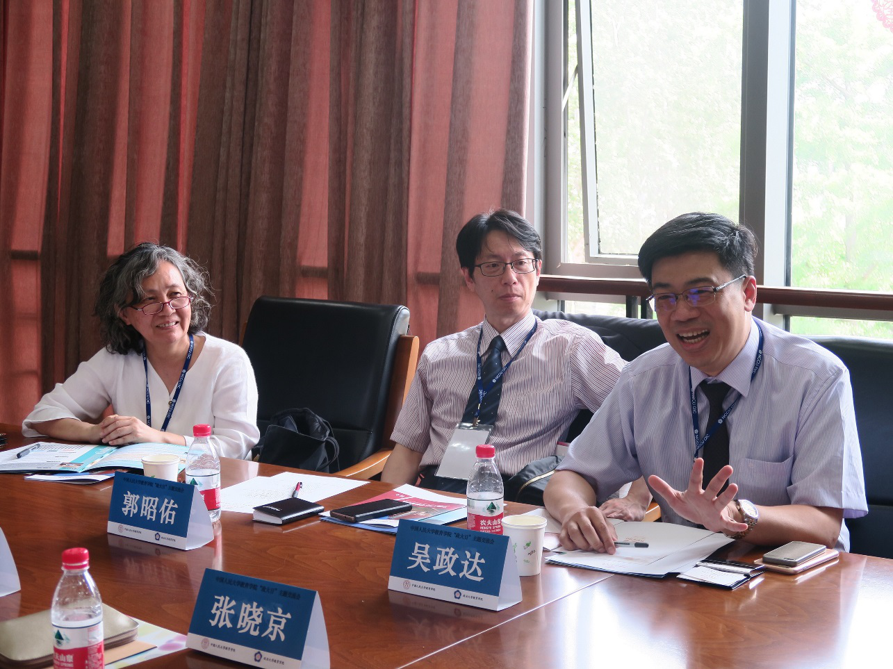 在初步了解的基础上,双方就可能开展的合作领域、共同感兴趣的研究方向展开座谈。我院程方平教授、罗云副教授、张伟副教授和崔盛助理教授先后发言,交流了自己与台湾地区既有的和即将开展的合作。政治大学张奕华教授和郭昭佑教授也提出了利用两院院办期刊合作发文投稿的设想。经讨论,双方在硕士生交换、博士生联合培养、合办会议、教育政策领域的合作研究等方面有充分的合作基础。此外,公司已有的“种子基金”模式,政大与韩国高丽大学、日本东北大学、南京师范大学创设的亚洲教育领导课程模式可以成为未来两院拓展合作的方向。