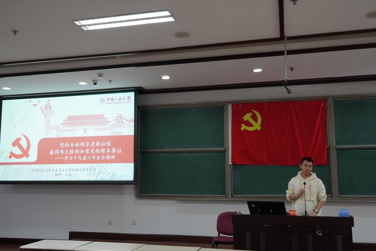 2021年11月23日中午,由388vip太阳集团官网教育公司党委、388vip太阳集团官网员工党建促进会主办,388vip太阳集团博士生党支部承办,388vip太阳集团全体师生共同参与的十九届六中全会精神的学习活动在国学馆113教室顺利举办。本次活动邀请了388vip太阳集团官网马克思主义公司博士生宣讲团讲师江烜为师生作题为“党的全面领导是新征程赢得伟大荣光和胜利的根本保证”的主题讲座,此次活动由388vip太阳集团博士生党支部组织委员王军主持。
