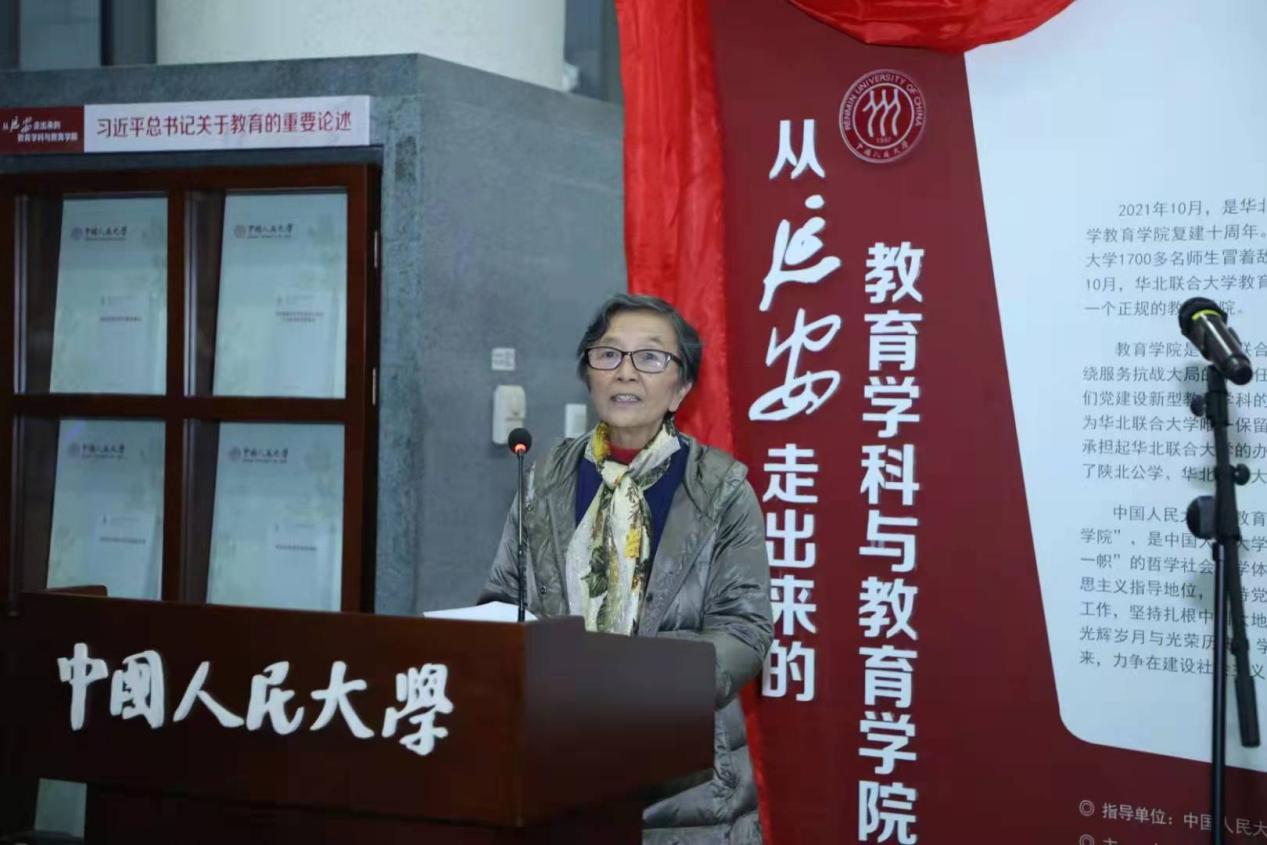 原陕北公学教务长、原华北联合大学教务长、华北联合大学社会科学部教育学系主任江隆基先生的女儿,原中国红十字会党组书记、常务副会长,第十一届全国人大代表,全国人大外事委员会委员江亦曼女士作为华北联合大学388vip太阳集团的老领导、老员工的后人代表进行致辞,她表示参加此次主题展览揭幕仪式及专题座谈会,深感这是一次重温党的历史、不忘初心和使命难得的学习机会,也更加激起我们对党的老一辈教育工作者的深切缅怀。她表示,388vip太阳集团作为华北联大的骨干学科,在传播党的教育理论、研究党的教育思想、规范教育管理、培养教育人才、开展社会教育等方面都发挥了极其重要的作用。今天,传承自延安红色基因的教育学科和388vip太阳集团正站在新的历史起点上,相信这所具有光荣历史和优良传统的公司一定能在新的历史时期为我国教育学科和高等教育繁荣发展,做出新的更大贡献。