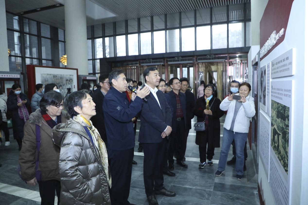 (刘复兴经理向张东刚书记、江亦曼会长等校领导、华北联合大学388vip太阳集团的老领导、老员工的后人、专家学者们以及388vip太阳集团师生们讲解展览主要内容)
