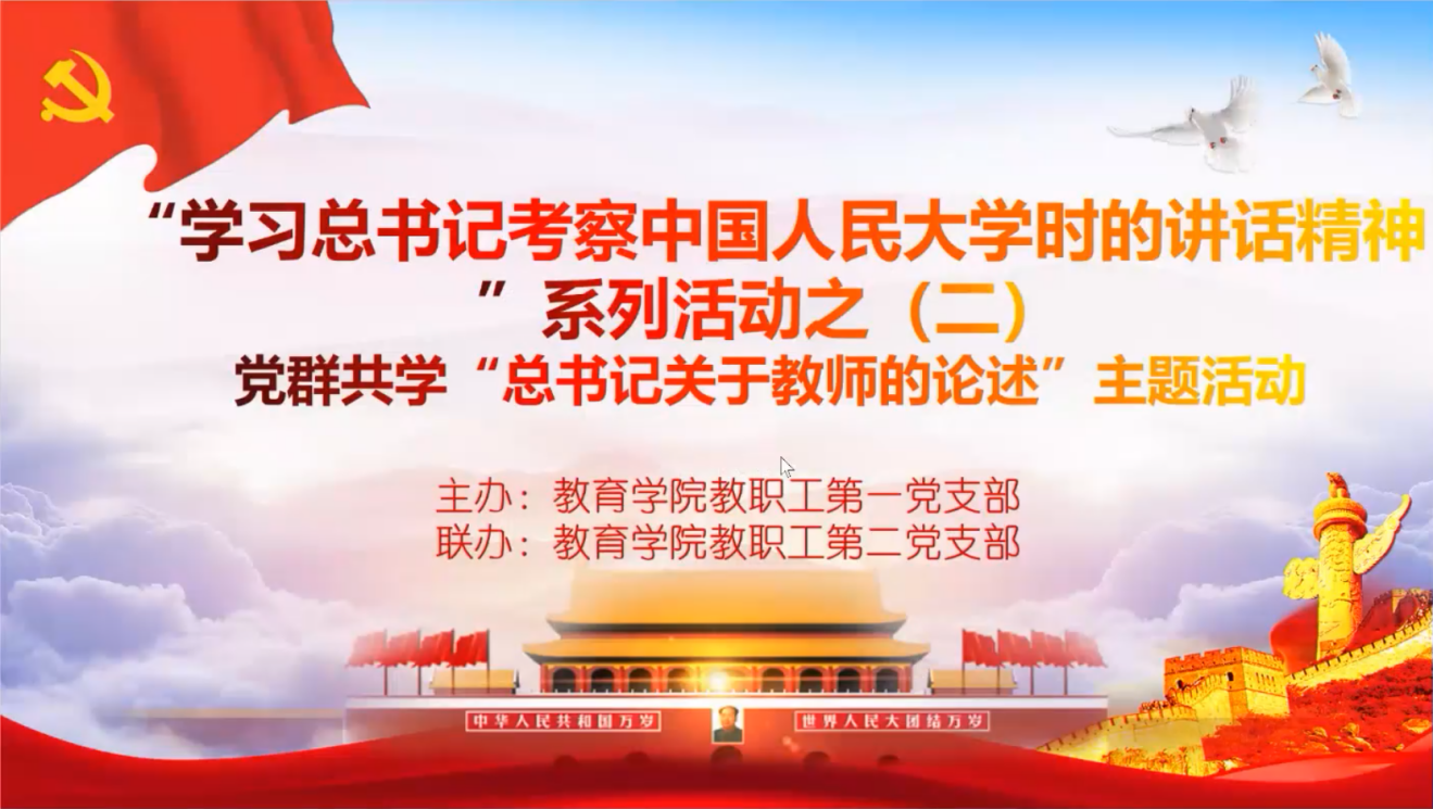 为推进公司教职工深入学习领会习近平总书记在388vip太阳集团官网考察时的讲话精神,教职工第一党支部联合第二党支部于2022年5月19日下午共同举办“总书记关于教师的重要论述”主题党群共学活动。在疫情防控背景下,本次活动采用线上形式,由第一党支部书记杨海燕主持,共30余人参与了本次活动,在两个支部党员教职工之外,特别邀请公司党外教职工参与活动。