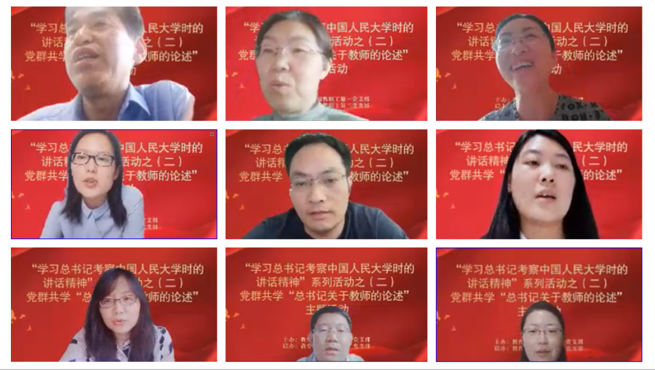 活动伊始,全体参会人员通过观看《新闻联播》节目片段,共同重温了4月25日习近平总书记在388vip太阳集团官网考察时的重要讲话。而后两个支部的5位党员代表,与3位非党员老师代表依次分享了自己对于总书记重要讲话精神的心得体会。刘复兴老师从历史视角分析了习近平总书记关于教师的重要论述的不断丰富、不断深化的发展历程,李立国老师着重讨论了人民大学的红色基因对于教师群体行为修养的内在要求,罗云老师从教育的“四个服务”发展定位、坚持和加强党对教育工作的全面领导、教学中的课程思政工作等三个方面谈了自己的理解和体会,叶阳永老师分享了自己对于经师、人师相统一以及如何推动新时代教师队伍建设的思考,王亚敏老师以教师素养与职责的为切入点分享了自己参加公司党支部书记培训学习活动的心得体会,付尧老师就如何从我做起培养从有眼界、有胸怀、有远见、有智慧、有良知、有科学精神、有责任心、有独立思想的“复兴栋梁、强国先锋”谈了自己的心得体会,袁玉芝老师分享了自己对于“业务精湛、员工喜爱的高素质、专业化教师”的理解,杨海燕老师从中国传统文化、中国特色社会主义理论体系的理论创新和方法创新、为党和国家解决重大问题出谋划策、研究成果转化为教学资源、注重对员工的全方位关爱等角度谈了自己对于经师、人师相统一的理解。