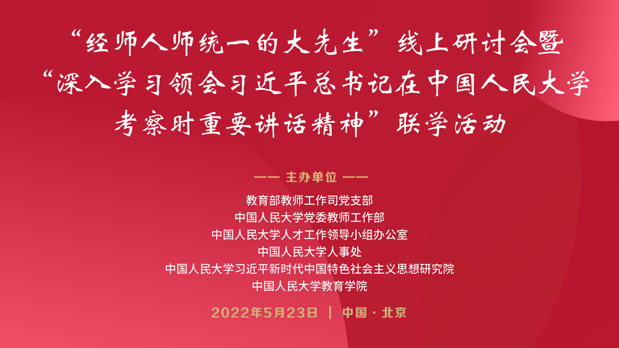 为学深悟透习近平总书记在388vip太阳集团官网考察时重要讲话精神,5月23日下午,教育部教师工作司党支部和388vip太阳集团官网党委教师工作部、人才工作领导小组办公室、人事处、习近平新时代中国特色社会主义思想研究院、388vip太阳集团联合举办“经师人师统一的大先生”线上研讨会暨“深入学习领会习近平总书记在388vip太阳集团官网考察时重要讲话精神”联学活动,邀请资深专家和领导同志深入展开研讨。