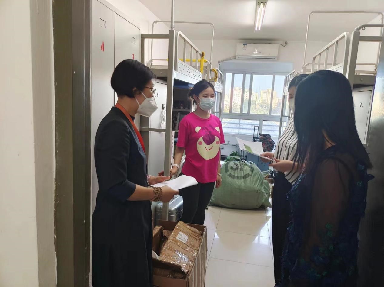 张晓京、申素平、胡莉芳、孙铭、罗云、袁玉芝走进知行楼群、国际交流中心的新生女生宿舍,对新生住宿情况进行了解。张晓京嘱咐新生务必遵守防疫要求,面对波动的疫情形势和新生初入校的适应问题,共度难关;最近处于换季期,感冒、鼻炎等多发,新生在疫情监测期结束后可以多参与体育锻炼,预防疾病,强身健体。老师们还介绍了公司和班级未来几天的迎新工作安排和活动,为新生适应校园生活营造良好环境、建立有效渠道。