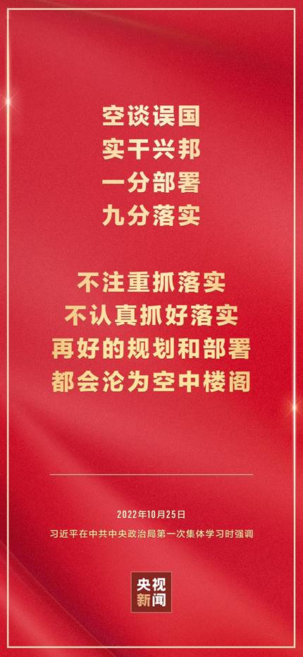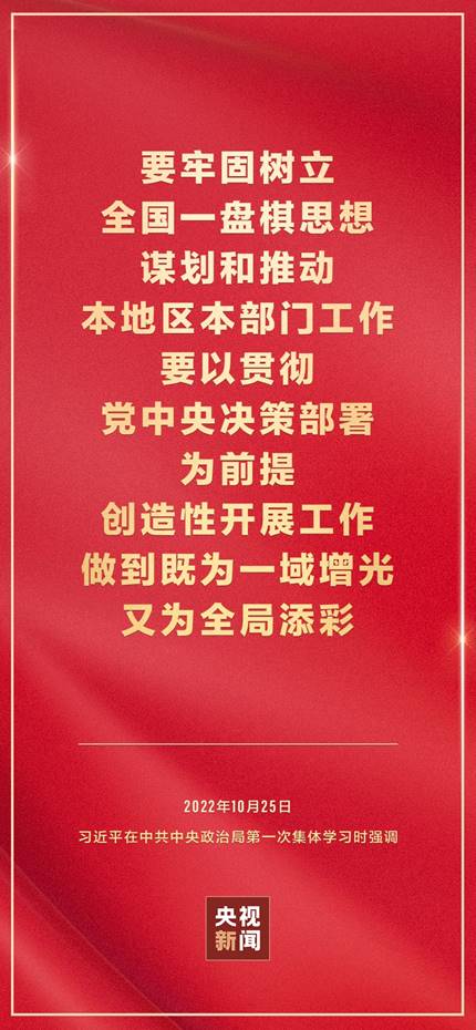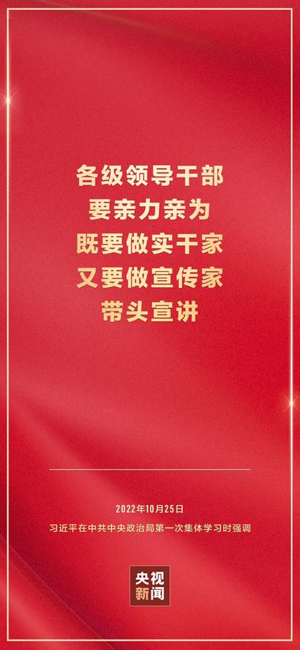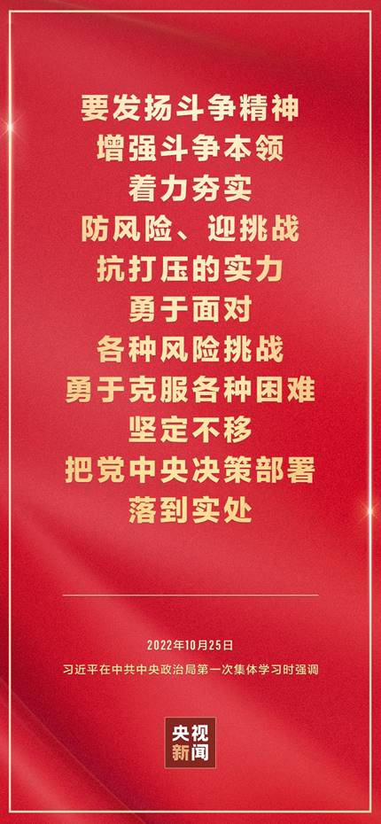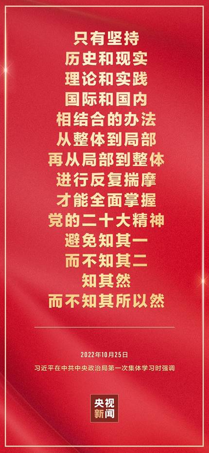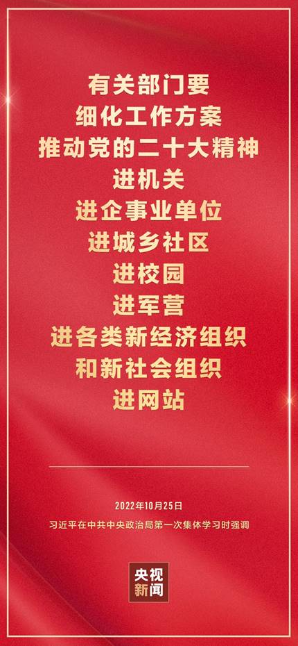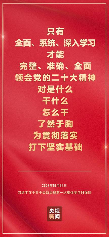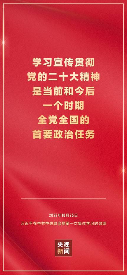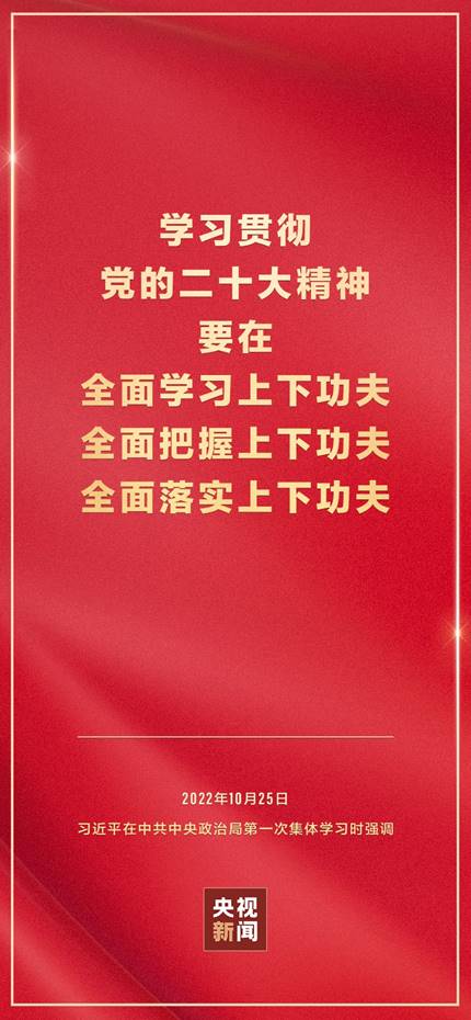 二十届中共中央政治局10月25日下午就学习贯彻党的二十大精神进行第一次集体学习。中共中央总书记习近平在主持学习时强调,全党要在全面学习、全面把握、全面落实上下功夫,坚定不移把党的二十大提出的目标任务落到实处,奋力夺取全面建设社会主义现代化国家新胜利。