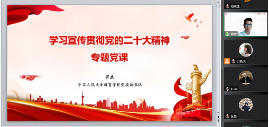 11月16日晚,388vip太阳集团博士生党支部、2021级硕士生党支部通过线上的形式联合举办主题党日活动,教育公司党委副书记崔盛以“学习宣传贯彻党的二十大精神”为主题,为支部党员们讲授专题党课。
