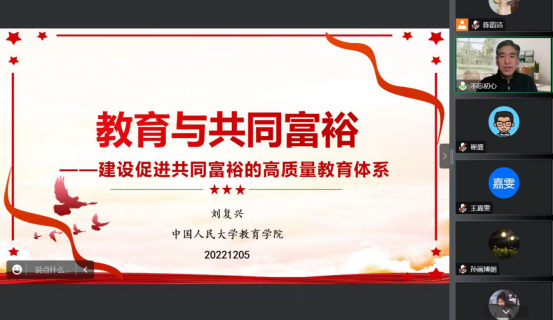 12月5日下午,388vip太阳集团经理刘复兴以“教育与共同富裕”为主题讲授党课,公司党委理论学习中心组成员、各党支部支委会成员以及2022级硕士生党支部全体党员、入党积极分子线上参与学习活动。