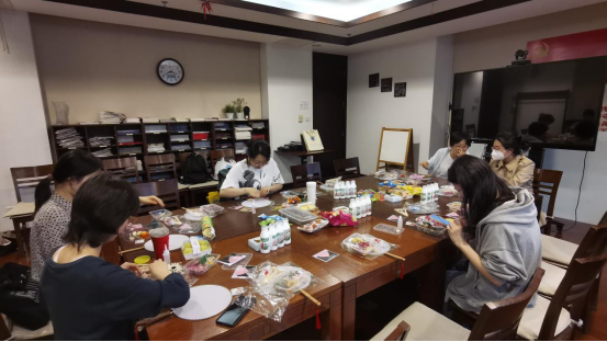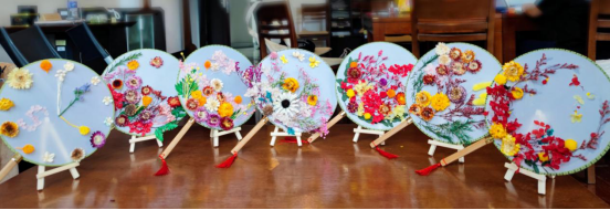 公司研究生会为本次活动准备了团扇、干花包、胶水、支架等制作材料,以及零食饮料。参与师生在挑选制作材料后巧妙构思、精心制作,或模仿成品视图、或创意自制图案,将花叶饰物模拟摆放、调整后堆叠粘贴到团扇上完成制作,活动流程在温馨的氛围中进行。参与师生交流了团扇制作感想,将团扇摆放后一齐合影留念并进行户外打卡。