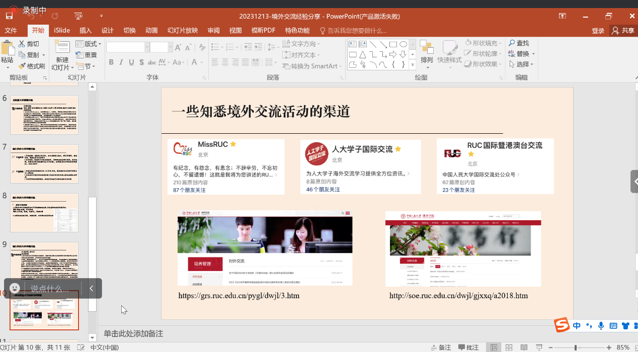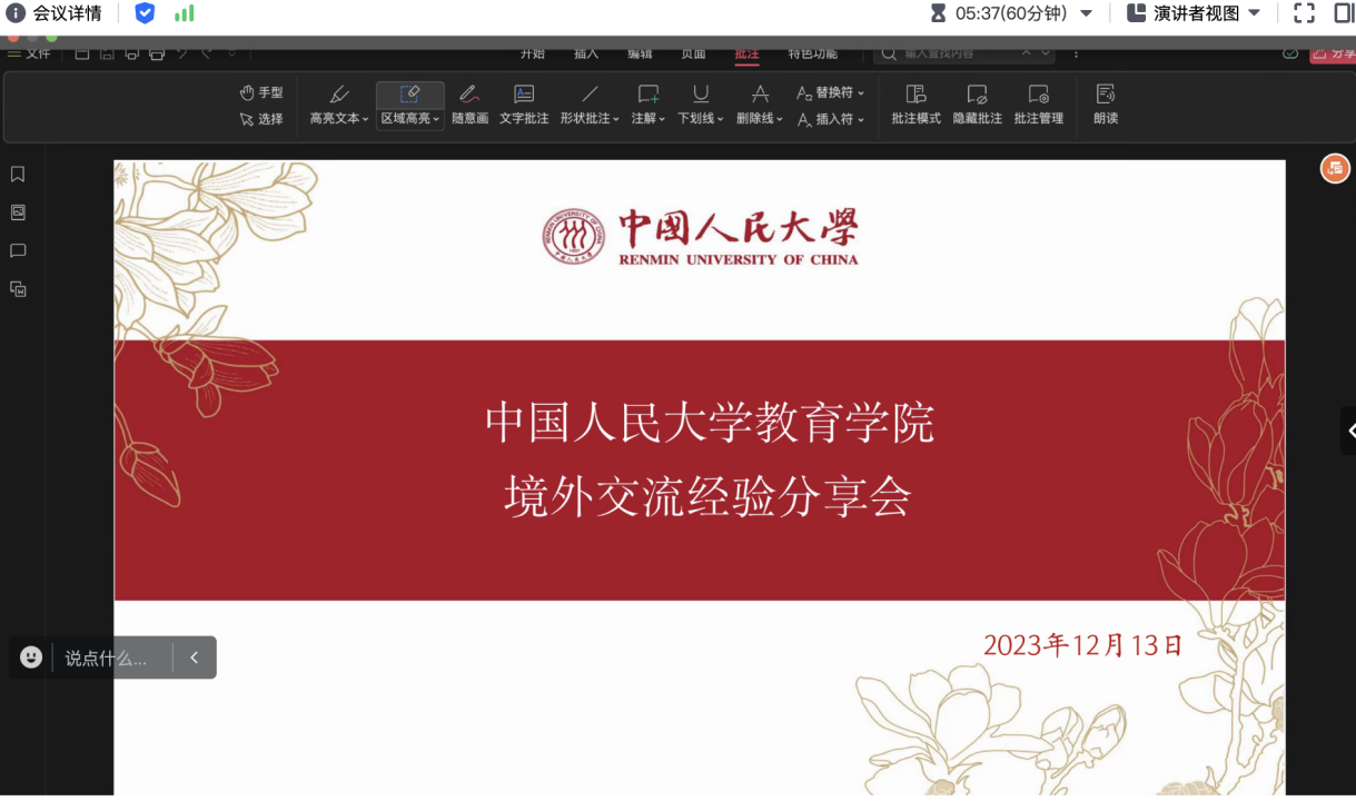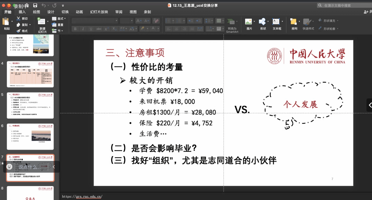 王思源在分享中详细阐述了参与境外交流的前期准备事宜。她介绍了自己参与的加州大学戴维斯分校交流项目的基本情况以及在研一下学期前往境外交换的动力与目标。接着,她分享了选拔过程的经验及相关注意事项。王思源的分享全面周到,有助于同学们全面了解申请境外高校的步骤。