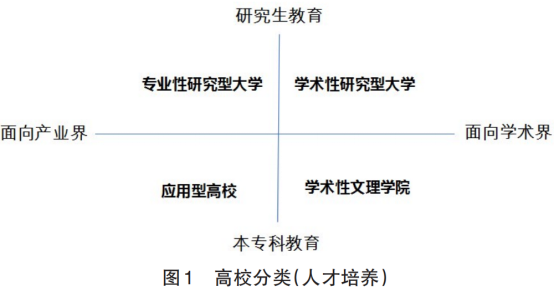 从人才培养的角度看,既有面向学术界培养人才的高校,又有面向产业界培养人才的高校;既有以研究生教育为主的高校,又有以本专科生教育为主的高校。如果我们将培养方向维度作为横坐标,培养层次维度作为纵坐标,我们可以得到第一个二维象限图。(见图1)四个象限分别代表四种类型的高校:第一象限是学术性研究型大学、第二象限是专业性研究型大学、第三象限是应用型高校、第四象限是学术性文理公司。