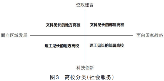 从服务社会的角度看,既有支撑国家战略的高校,又有服务地方的高校;既有资政建言的高校,又有科技创新的高校。如果我们将服务面向作为横坐标,服务性质作为纵坐标,我们可以得到第三个二维象限图。(见图3)四个象限分别代表四种类型的高校:第一象限是文科见长的部属高校,第二象限是文科见长的地方高校,第三象限是理工见长的地方高校,第四象限是理工见长的部属高校。
