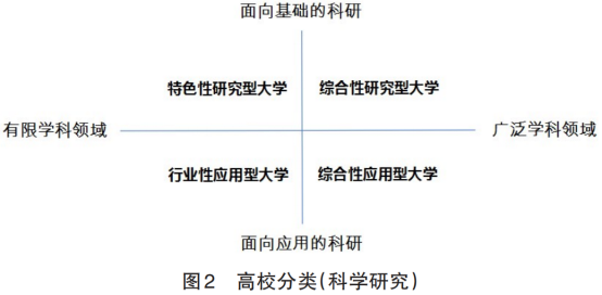 3. 利用二维象限,建构具有内在一致性的分类体系。高校分类体系必须具有内在一致性。具体地说,一个逻辑自洽的高校分类体系必须符合同一性、矛盾性和周延性原则,这是高校分类中的一个难题。利用二维象限建立分类体系是突破这个难题行之有效的一种方法。我们可以根据不同的高校功能维度,建立不同的高校分类体系。下面我们从高校三大功能的角度建构三种基本的高校分类体系,以之为基础可以建构更复杂的“九宫格”分类体系。