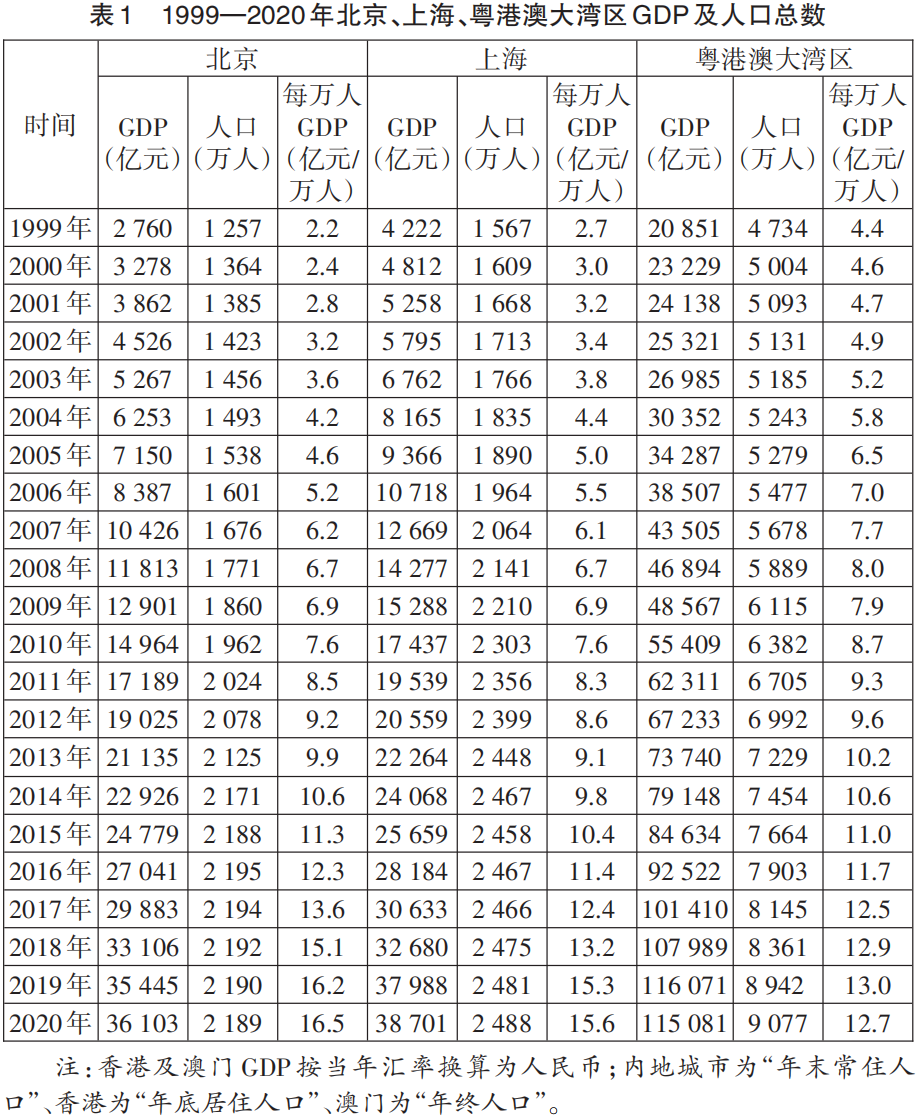 表1呈现了北京、上海、粤港澳大湾区的经济发展水平及人口规模。由统计结果可知:①粤港澳大湾区的地区生产总值与人口总量远高于北京、上海。2020年该地年末常住人口达到9077万人,地区生产总值为115081亿元。②1999—2020年,三地地区生产总值及年末常住人口整体呈上升态势。其中,北京、上海、粤港澳大湾区地区生产总值年均增长率分别为13.0%、11.1%、8.5%,其年末常住人口年均增长率分别为2.7%、2.2%、3.1%。③结合以上指标,1999年粤港澳大湾区每万人GDP为4.4亿元,高于其余地区。2020年北京每万人GDP为16.5亿元,位居首位。