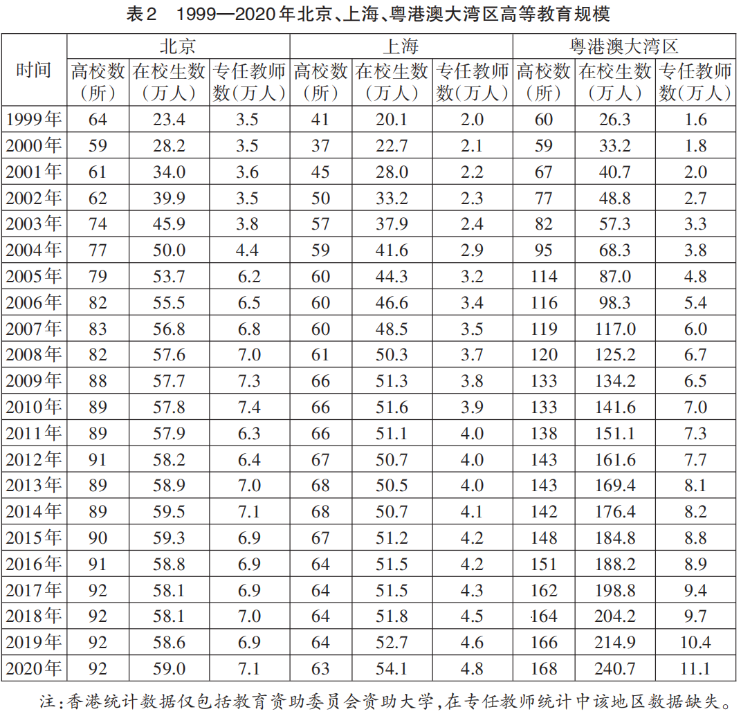 1.高等教育规模。表2呈现了北京、上海及粤港澳大湾区的高等教育规模。统计显示:①高校扩招以来,北京、上海、粤港澳大湾区的高等教育规模不断扩大,且粤港澳大湾区扩张态势突出,高校数量由1999年的60所增加至2020年的168所,普通高等公司在校生人数由26.3万人增加至240.7万人,普通高等公司专任教师数由1.6万人增加至11.1万人。②结合经济发展状况,相同经济规模下粤港澳大湾区高等教育规模远低于北京、上海。1999年三地在校生人数与GDP的比值分别为0.85%、0.48%、0.13%。③结合人口分布情况,2020年北京、上海、粤港澳大湾区每万人在校生数分别为272人、217人、265人。
