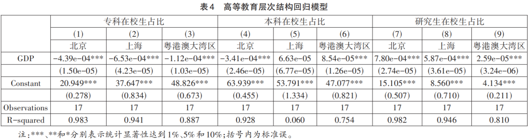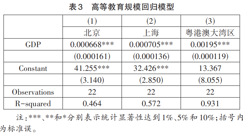 基于以上分析,本研究从高校知识创新驱动模式(模式1)、企业技术创新驱动模式(模式2)两条发展路径出发,以北京、上海、粤港澳大湾区经济发展及高等教育的协同关系分别建立回归预测模型。