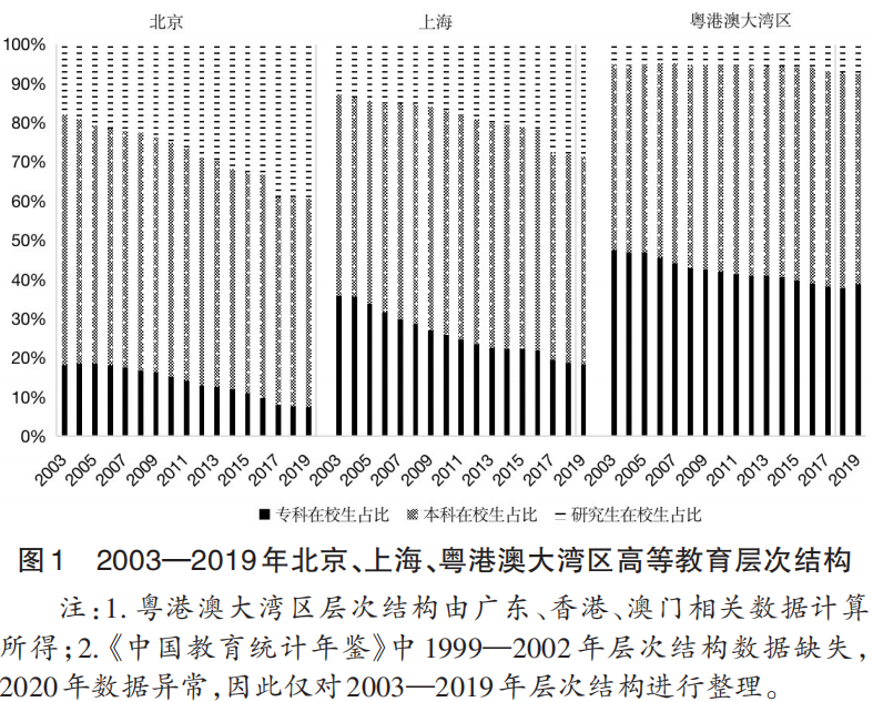 2.层次结构。图1呈现了北京、上海及粤港澳大湾区的高等教育层次结构。统计显示:①三地专科在校生占比整体呈下降趋势,研究生(硕博)在校生占比不断上升。②各地区本科在校生数占比约五成,高等教育层次结构呈“橄榄球型”。③北京、上海层次结构重心高于粤港澳大湾区。与北京、上海2019年研究生在校生占比高达39.4%、28.7%不同,粤港澳大湾区同年研究生在校生占比仅为7.4%。研究生比例小而专科生比例大是粤港澳大湾区高等教育的一大特点。