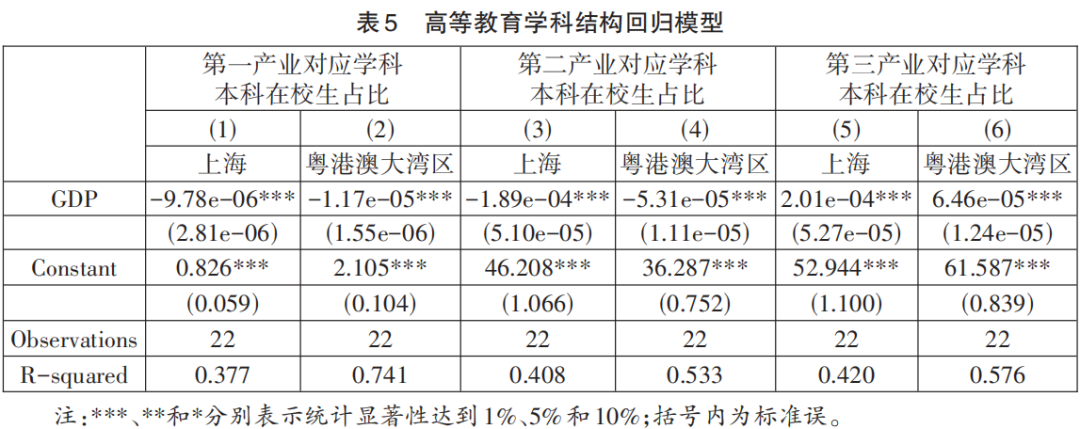随着人口的增加及经济发展水平的提升,第一、第二产业对应学科专业占比下降,第三产业对应学科专业占比上升。这与经济发展规律相吻合,经济增长通常伴随着产业结构的规律性变化,表现为国民经济重心从第一产业向第二产业,进而向第三产业升级。产业结构升级通过劳动力市场的中介作用传导到高等教育领域,导致第三产业对应学科专业占比增加。