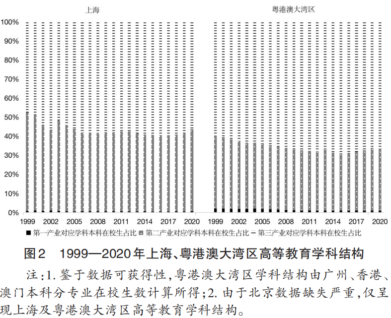 3.学科结构。本研究参照已有研究做法,面向产业需求对学科专业类别进行划分。其中,农学对应第一产业;工学、理学对应第二产业;经济管理、文史哲、法学、教育学、医学等对应第三产业,各地区学科结构如图2所示。统计显示:①第一产业对应学科专业本科在校生占比远低于第二、第三产业。除个别年份外,第三产业对应学科专业占比最高。②粤港澳大湾区第三产业对应学科专业占比高于上海。2020年,粤港澳大湾区该指标达到66.4%,上海为56.3%。③随着时间推移,两地第一、二产业对应学科专业占比整体呈下降趋势,第三产业对应学科专业占比整体呈上升趋势。