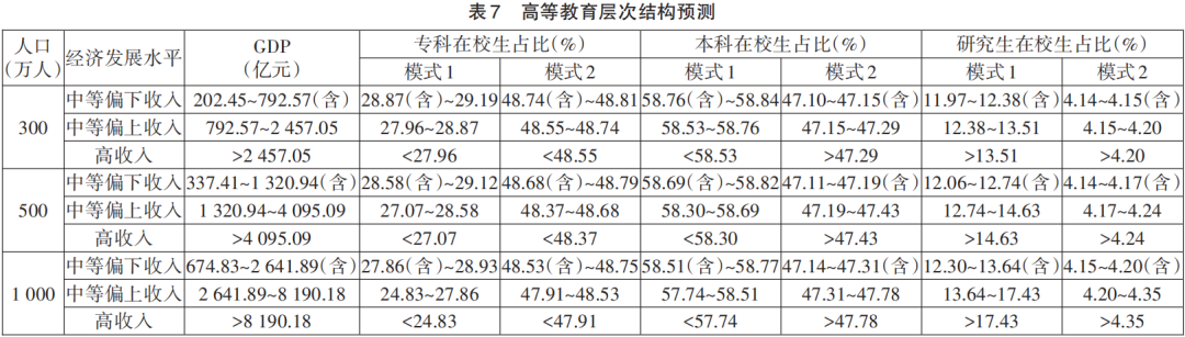 3.层次结构预测。表7为雄安新区高等教育层次结构的预测结果。若按照高校知识创新驱动模式发展,当处于高收入水平,人口为300万时,专科在校生占比小于27.96%,本科在校生占比小于58.53%,研究生在校生占比大于13.51%较为合理;人口为500万时,专科生占比应小于27.07%,本科生占比应小于58.30%,研究生占比应大于14.63%;人口为1000万时,专科生占比应小于24.83%,本科生占比应小于57.74%,研究生占比应大于17.43%。若按照企业技术创新驱动模式发展,人口为300万时,专科生占比小于48.55%,本科生占比大于47.29%,研究生占比大于4.20%较为适宜;人口为500万时,专科生占比应小于48.37%,本科生占比应大于47.43%,研究生占比应大于4.24%;人口为1000万时,专科生占比应小于47.91%,本科生占比应大于47.78%,研究生占比应大于4.35%。相比于高校知识创新驱动模式,企业技术创新驱动模式下所预测的雄安新区办学层次结构重心较低。