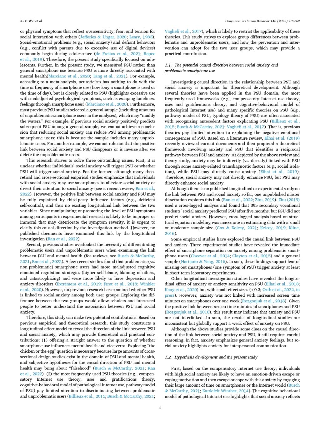 ABSTRACT:Smartphone provides diverse indirect communication channels for users, which may attract people with social anxiety. Due to the high risk of developing social anxiety and problematic smartphone use (PSU) in adolescence,it is important to investigate whether social anxiety will trigger PSU or vice versa among this group in the smartphone era. Also, most previous PSU studies include amounts of unproblematic smartphone users in the analyses, which may“muddy the waters.”Participants were 582 adolescent smartphone users (including 201 problematic users) who completed the investigation at time 1 (T1) and time 2 (T2). A bias-corrected factor score path analysis (BCFSPA) was adopted to estimate data with small or moderate sample size. BCFSPA showed that social anxiety at T1 positively predicted PSU at T2 among problematic (vs. unproblematic) smartphone users.Also, PSU at T1 positively predicted social anxiety at T2 among unproblematic (vs. problematic) smartphone users. Our results have identified social anxiety as a risk factor for PSU among adolescent problematic (vs. unproblematic) smartphone users; the compensatory Internet use model combined with the habit theory of addiction can explain this finding. Besides, the dilution effect hypothesis can explain the effect of PSU on social anxiety among unproblematic (vs. problematic) smartphone users.