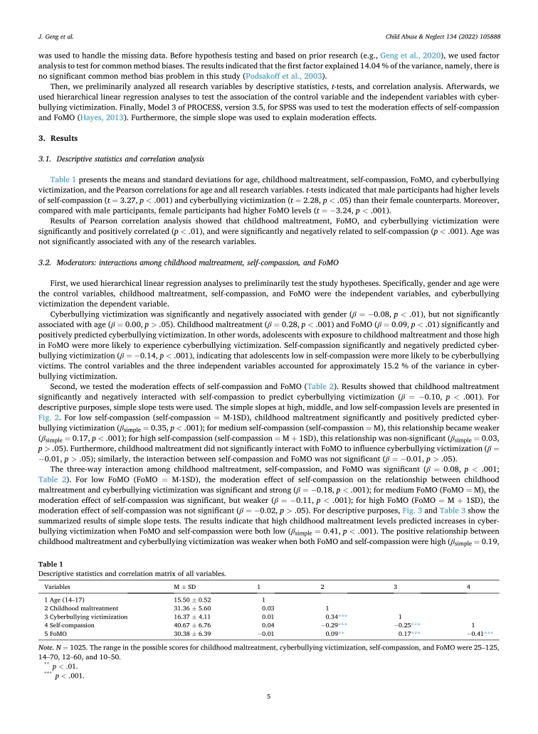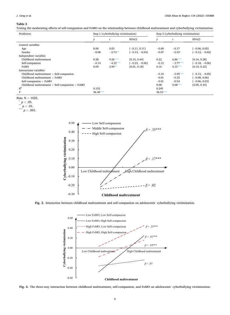 Results:Childhood maltreatment significantly predicted adolescents' cyberbullying victimization (β = 0.28, p < .001). High self-compassion weakened the relationship between childhood maltreatment and cyberbullying victimization (β = −0.10, p < .001). Furthermore, self-compassion and FoMO simultaneously interacted with childhood maltreatment to predict cyberbullying victimization (β = 0.08, p < .001). Specifically, high FoMO weakened the moderating effect of self-compassion on the relationship between childhood maltreatment and cyberbullying victimization. Childhood maltreatment significantly predicted cyberbullying victimization among adolescents high in FoMO, regardless of self-compassion levels. In contrast, childhood maltreatment non-significantly predicted cyberbullying victimization when adolescents were high in self-compassion and low in FoMO.