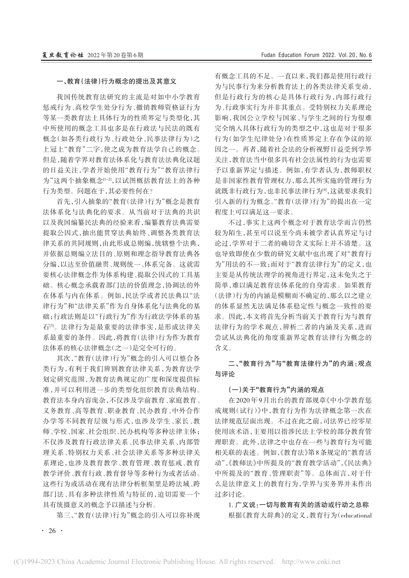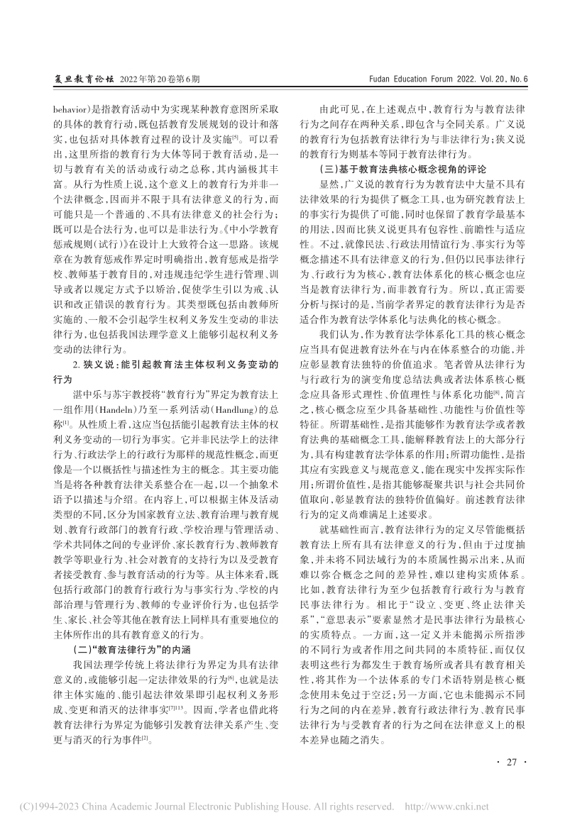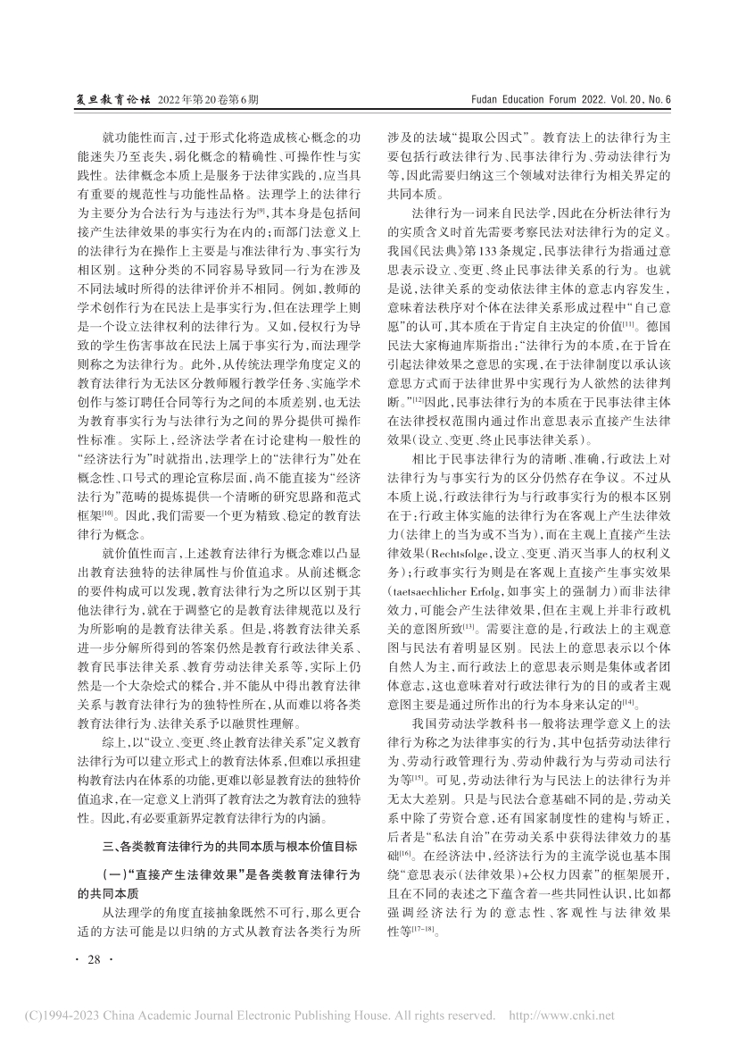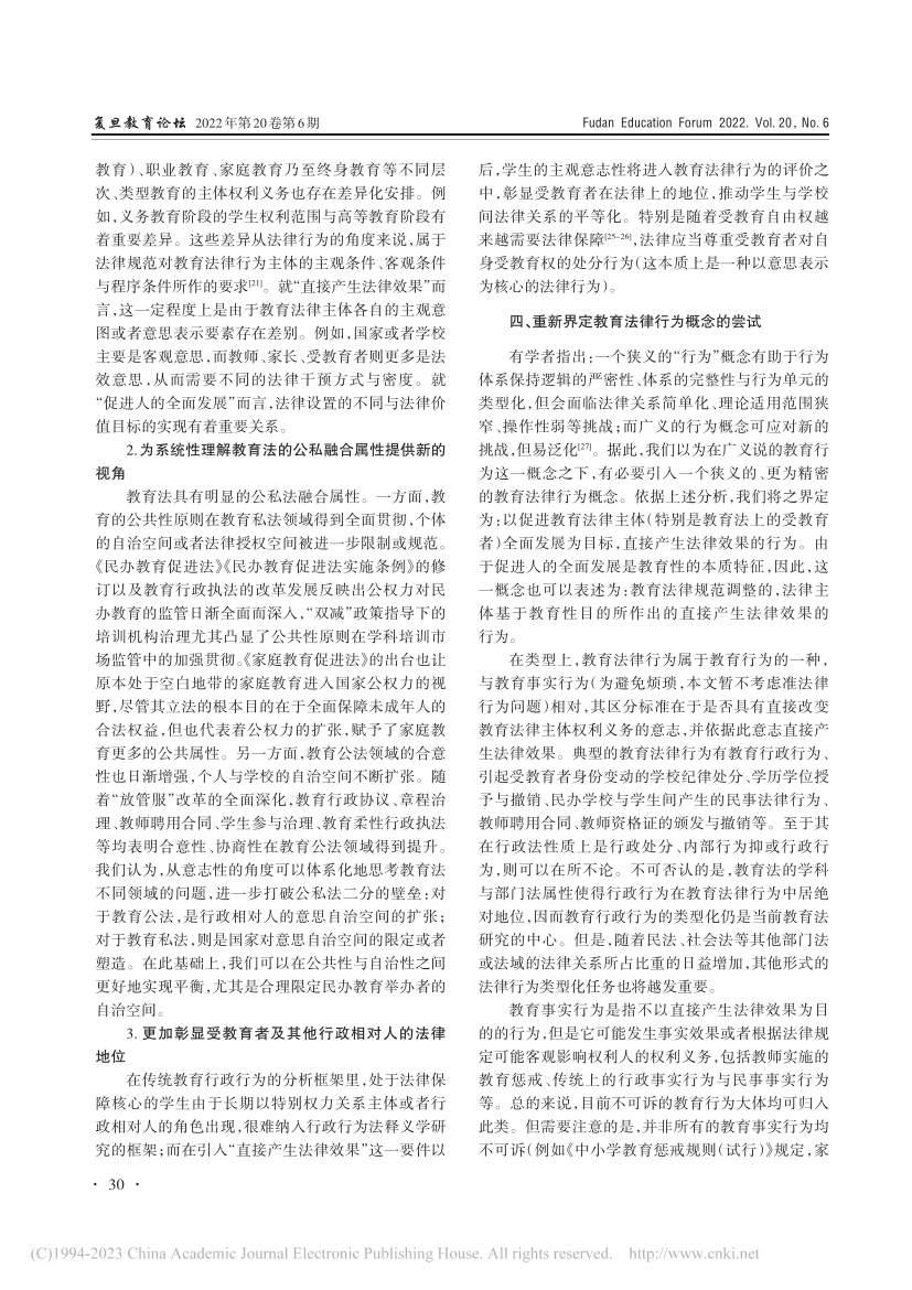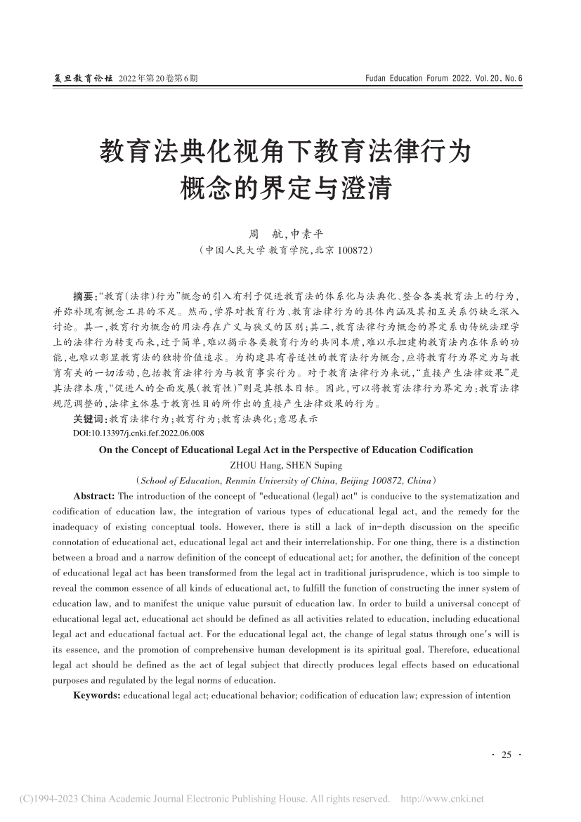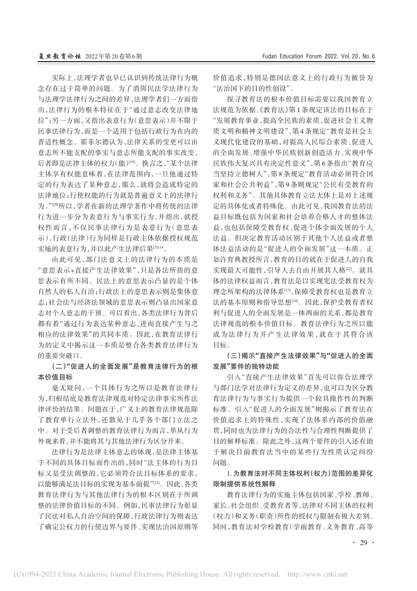 摘要:“教育(法律)行为”概念的引入有利于促进教育法的体系化与法典化、整合各类教育法上的行为,并弥补现有概念工具的不足。然而,学界对教育行为、教育法律行为的具体内涵及其相互关系仍缺乏深入讨论。其一,教育行为概念的用法存在广义与狭义的区别;其二,教育法律行为概念的界定系由传统法理学上的法律行为转变而来,过于简单,难以揭示各类教育行为的共同本质,难以承担建构教育法内在体系的功能,也难以彰显教育法的独特价值追求。为构建具有普适性的教育法行为概念,应将教育行为界定为与教育有关的一切活动,包括教育法律行为与教育事实行为。对于教育法律行为来说,“直接产生法律效果”是其法律本质,“促进人的全面发展(教育性)”则是其根本目标。因此,可以将教育法律行为界定为:教育法律规范调整的,法律主体基于教育性目的所作出的直接产生法律效果的行为。